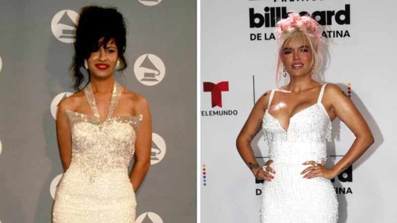 En la gala de los Latin Billboard, Karol G se lanzó con un vestido blanco ajustado con un pronunciado escote y embellecido con cristales y flecos, el cual para sus seguidores recordó gratamente al modelo que vistió Selena Quintanilla en la premiación de los Grammy de 1994.