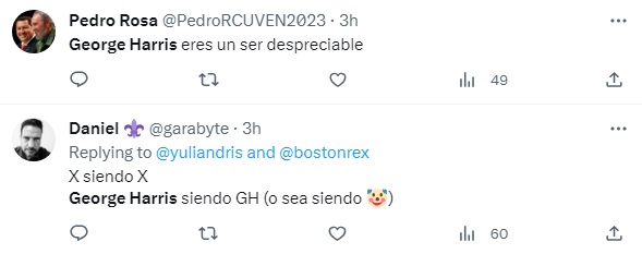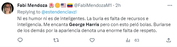 Muchos usuarios en las plataformas digitales no estuvieron de acuerdo con los comentarios y no lo perdonaron. “Yo de verdad detesto la voz y “humor” de George Harris”, “George Harris es un viejo déjenlo ser”, “Me encanta George Harris pero con estó p*eló bol@s”, “Burlarse de los demás por la apariencia denota una enorme falta de respeto”, “George Harris es un ser despreciable”, son algunos de los duros comentarios emitidos por los internautas.